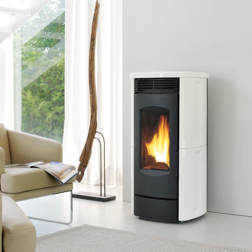 Cet habillage se caractérise par sa porte en fonte vernie en noir, dont le profil évasé fait ressortir la chambre de combustion et permet une large vision de la flamme. Le revêtement en faïence présente une forme arrondie, avec un profil en creux sur les côtés qui reprend le motif esthétique de la porte en fonte et du couvercle. Disponible en blanc poli, bordeaux poli ou crème sable