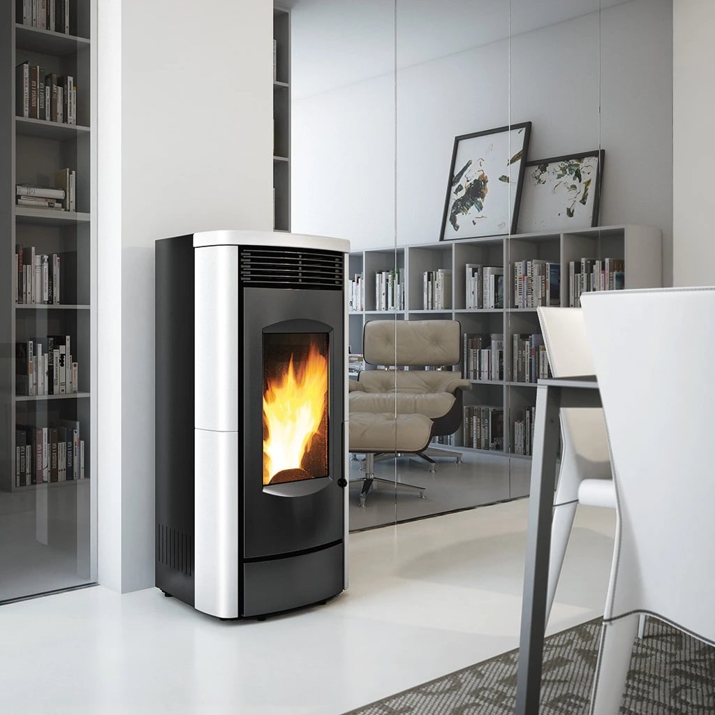 Corps de chauffe à pellets étanche à ventilation frontale. Sortie des fumée et arrivée d’air supérieure en conduit concentrique 80/130 intégré dans le corps. Contrôle avec un tableau de commande tactile.