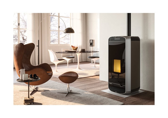 Poêle étanche à air avec système Flex Air pour la déviation à l’avant ou sur le dessus de l’air. Design innovant, avec dessus et embase en aluminium et côtés déclinés en divers matériaux au choix. Doté de sorties des fumées avec tube coaxial sur le dessus et charge des granulés à écluse.